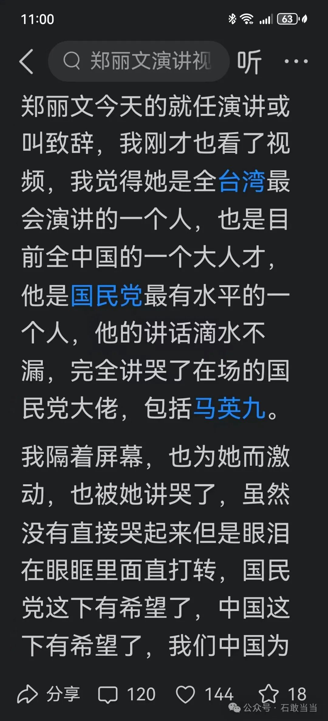 大陆也有人在头条上发文说:隔着屏幕也被她讲哭了!国民党这下有希望了!祖国统一有望了!!!