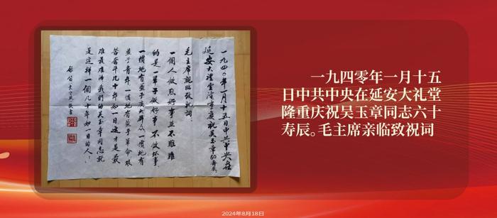 一九四零年一月十五日中共中央在延安大礼堂隆重庆祝吴玉章同志六十寿辰。毛主席亲临致祝词:“一个人做点好事并不难,难的是一辈子做好事,不做坏事,一惯地有益于广大群众,一惯地有益于青年,一惯地有益于革命,艰苦奋斗几十年如一日,这才是最难最难的!我们的吴玉章同志就是这样一个几十年如一日的人!”